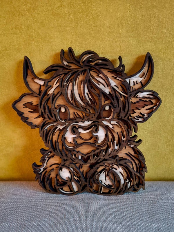 Deze schattige Schotse hooglander heb ik helemaal met de hand gebeitst en zorgvuldig afgewerkt (een enorm werk, maar meer dan waard;) Door de meerdere lagen hout krijgt het kalfje een prachtig 3D-effect, waardoor het echt tot leven komt.
