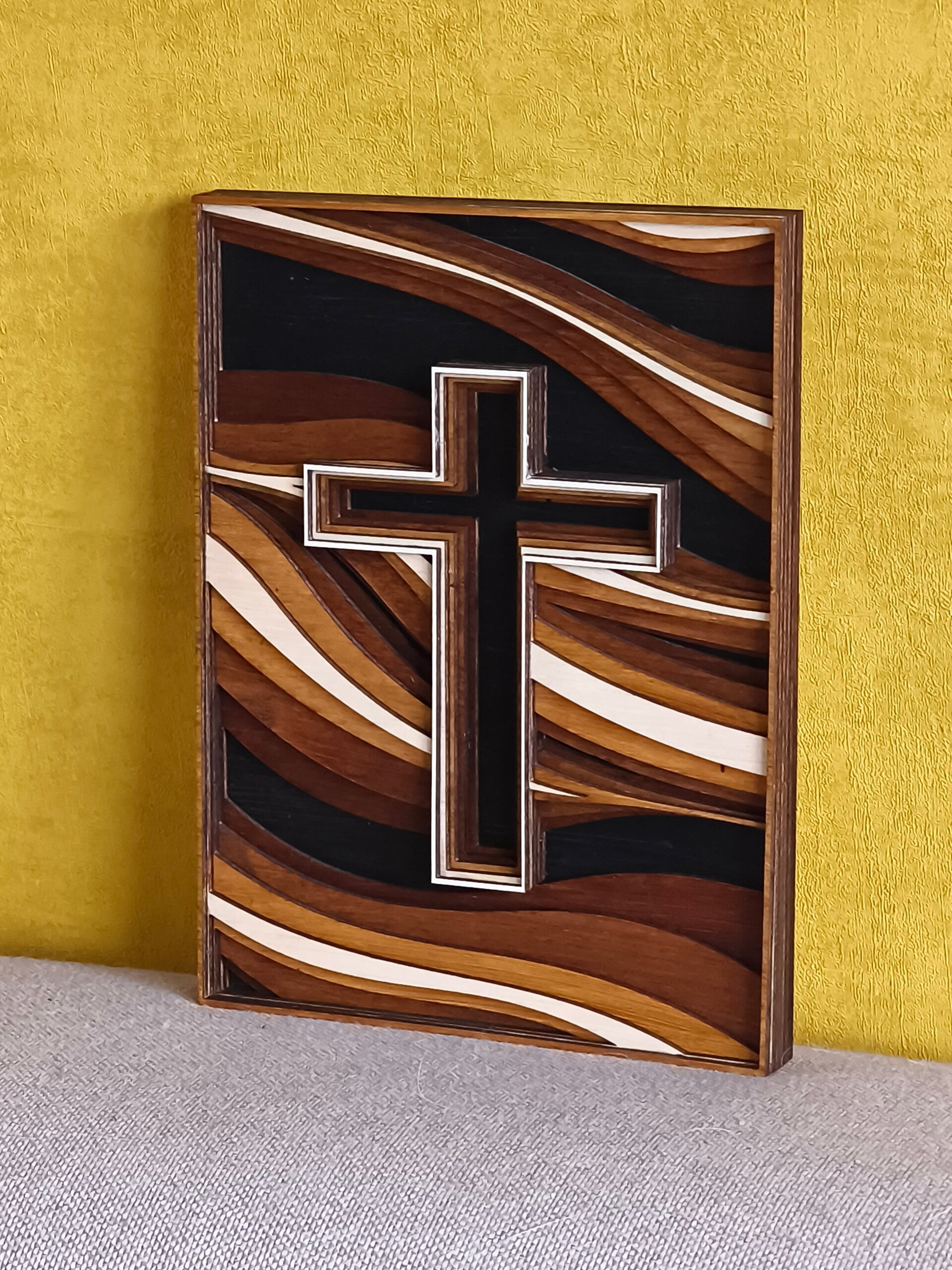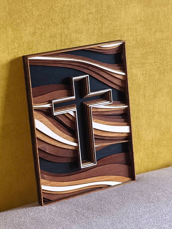 Het kruis in het midden is eveneens meerlaags opgebouwd, waardoor het krachtig naar voren komt tegen de golvende achtergrond. De gelaagdheid creëert mooie schaduwen en een luxe uitstraling, perfect voor wie houdt van ambachtelijk vakwerk en natuurlijke materialen.